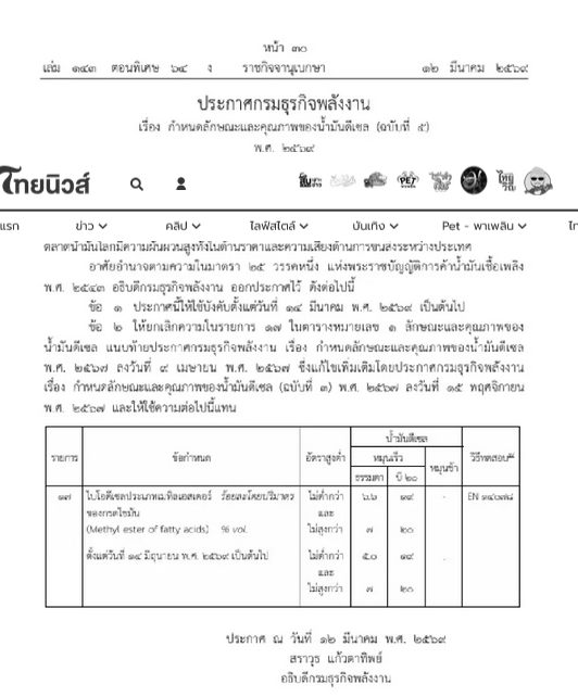 เว็บไซต์ ราชกิจจานุเบกษา เผยแพร่ประกาศของ กรมธุรกิจพลังงาน เรื่องกำหนดลักษณะและคุณภาพของน้ำมันดีเซล (ฉบับที่ 5) พ.ศ. 2569 โดยมีการปรับปรุงข้อกำหนดเกี่ยวกับคุณภาพน้ำมันดีเซล ด้วยการเพิ่มสัดส่วนการผสมไบโอดีเซลประเภทเมทิลเอสเตอร์ของกรดไขมันในน้ำมันดีเซลหมุนเร็วธรรมดา เพื่อรองรับการบริหารจัดการพลังงานของประเทศ ท่ามกลางสถานการณ์ความขัดแย้งในภูมิภาคตะวันออกกลางที่ส่งผลให้ตลาดน้ำมันโลกมีความผันผวนทั้งด้านราคาและความเสี่ยงด้านการขนส่งระหว่างประเทศ