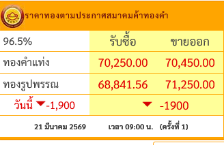 ราคาทองคำวันนี้ ประจำวันที่ 21 มี.ค.2569 ร่วงลงแรง 1,900 บาท โดยทองรูปพรรณขายออกที่บาทละ 71,250 บาท อ้างอิงข้อมูลล่าสุดจาก สมาคมค้าทองคำ ที่เผยแพร่ผ่านทางเว็บไซต์ เมื่อเวลา 09.00 น.ที่ผ่านมา