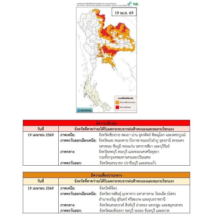 พื้นที่เสี่ยงสูง คาดว่าจะได้รับผลกระทบจากฝนฟ้าคะนองและลมกระโชกแรง