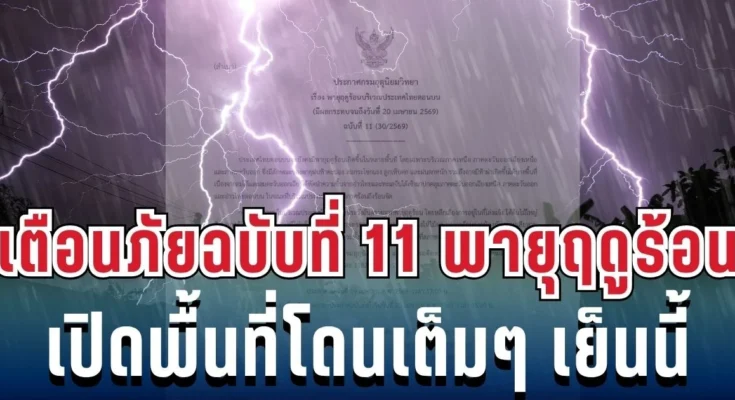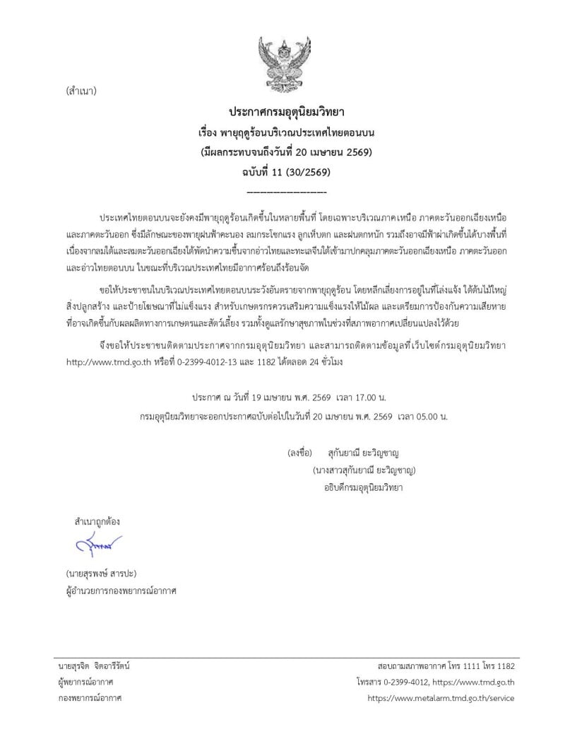 กรมอุตุนิยมวิทยา ประกาศเตือนฉบับที่ 11 เรื่อง พายุฤดูร้อนบริเวณประเทศไทยตอนบน มีผลกระทบจนถึงวันที่ 20 เมษายน 2569 โดยระบุว่า ประเทศไทยตอนบนยังคงมีพายุฤดูร้อนเกิดขึ้นในหลายพื้นที่ โดยเฉพาะภาคเหนือ ภาคตะวันออกเฉียงเหนือ และภาคตะวันออก มีลักษณะเป็นพายุฝนฟ้าคะนอง ลมกระโชกแรง ลูกเห็บตก ฝนตกหนัก และอาจมีฟ้าผ่าบางพื้นที่