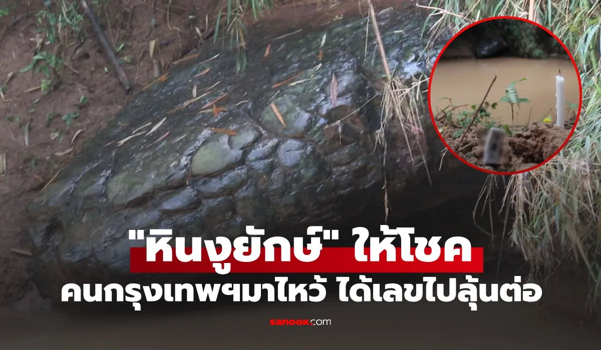 แห่กราบไหว้ขอพร “หินงูยักษ์” เชื่อเป็นร่างของพญานาคราช หนุ่มใหญ่ขับรถจากกรุงเทพฯ มาถวายบายศรี หลังโชคดีในงวดที่ผ่านมา พร้อมจุดธูปขอเลขเด็ดในงวดต่อไป