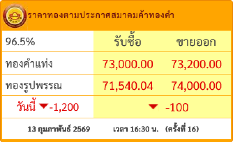 ราคาทองคำประจำวันที่ 13 ก.พ.2569 ร่วงแรง 1,200 บาท เปรียบเทียบกับราคาสุดท้ายของวันที่ 12 ก.พ.ที่ผ่านมา โดยราคาทองรูปพรรณขยับมาอยู่ที่บาทละ 74,000.00 บาท อ้างอิงข้อมูลล่าสุดจาก สมาคมค้าทองคำ ที่เผยแพร่ผ่านทางเว็บไซต์ เมื่อเวลา 16:30 น.(ครั้งที่ 16)