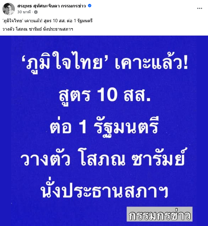 ล่าสุด ด้าน สรยุทธ สุทัศนะจินดา ผู้ประกาศข่าวชื่อดัง ได้ออกมาโพสต์ข้อความผ่านเพจเฟซบุ๊ก สรยุทธ สุทัศนะจินดา กรรมกรข่าว โดยระบุว่า ภูมิใจไทย เคาะแล้ว สูตร 10 สส. ต่อ 1 รัฐมนตรี วางตัว โสภณ ซารัมย์ นั่งประธานสภาฯ