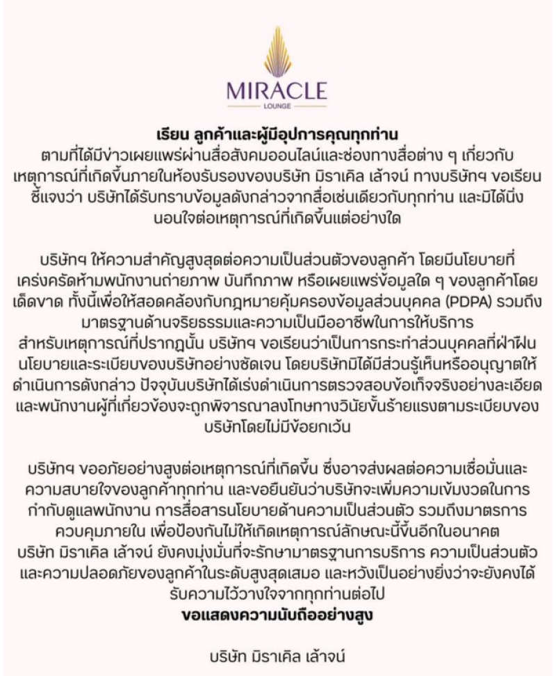 ตามที่ได้มีข่าวเผยแพร่ผ่านสื่อสังคมออนไลน์และช่องทางสื่อต่าง ๆ เกี่ยวกับเหตุการณ์ที่เกิดขึ้นภายในห้องรับรองของบริษัท มิราเคิล เล้าจน์ ทางบริษัทฯ ขอเรียนชี้แจงว่า บริษัทได้รับทราบข้อมูลดังกล่าวจากสื่อเช่นเดียวกับทุกท่าน และมิได้นิ่งนอนใจต่อเหตุการณ์ที่เกิดขึ้นแต่อย่างใด