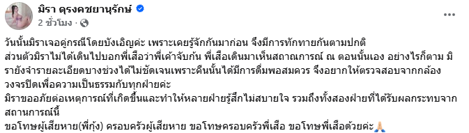 ล่าสุด มิรา ดุรงคชยานุรักษ์ ได้โพสต์ข้อความชี้แจงผ่านเฟซบุ๊กชื่อ มิรา ดุรงคชยานุรักษ์ ระบุว่า ในวันเกิดเหตุได้พบคู่กรณีโดยบังเอิญ เนื่องจากเคยรู้จักกันมาก่อน จึงมีการทักทายกันตามปกติ พร้อมยืนยันว่า ตนไม่ได้เป็นฝ่ายเดินไปบอกพี่เสือว่าถูกจับก้น แต่พี่เสือเป็นผู้ที่เดินมาเห็นเหตุการณ์ในช่วงเวลานั้นเอง