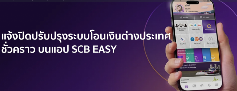 วันเสาร์ที่ 7 มีนาคม 2569 เวลา 01:00 น. ถึง 10:00 น. ลูกค้าไม่สามารถใช้บริการโอนเงินต่างประเทศบนแอป SCB EASY ได้