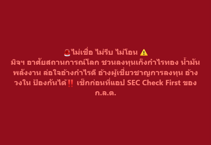 ขอเตือนประชาชนให้ตั้งสติ อย่าหลงเชื่อคำชักชวนโดยเฉพาะการลงทุนที่ไม่รู้จักตัวตนผู้ชักชวนชัดเจน ก่อนตัดสินใจลงทุนทุกครั้ง ควรตรวจสอบข้อมูลให้รอบคอบ และไม่ควรรีบโอนเงินเด็ดขาด