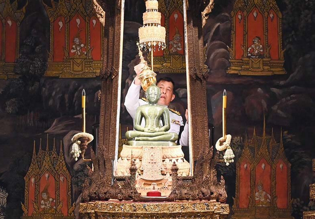 เมื่อเสด็จพระราชดำเนินถึง เสด็จเข้าพระอุโบสถวัดพระศรีรัตนศาสดาราม พระบาทสมเด็จพระเจ้าอยู่หัว เสด็จพระราชดำเนินไปด้านหลังฐานชุกชี เสด็จขึ้นเกยไปยังบุษบกที่ประดิษฐานพระพุทธมหามณีรัตนปฏิมากร ทรงถวายพวงมาลัยสักการะพระพุทธมหามณีรัตนปฏิมากร ทรงกราบ