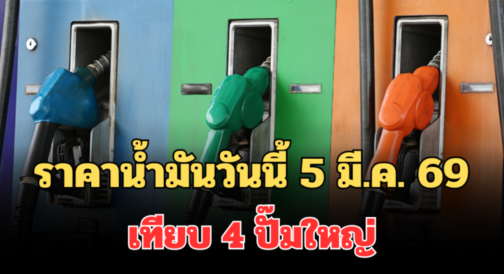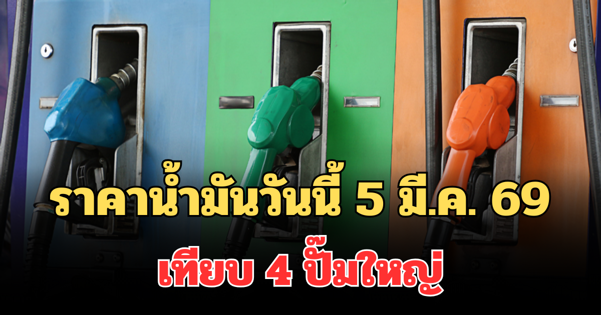วันที่ 5 มีนาคม 2569 ทางสำนักงานนโยบายและแผนพลังงาน (สนพ.) กระทรวงพลังงาน รายงานสถานการณ์ราคาน้ำมันประจำวัน โดยระบุราคาจำหน่ายของสถานีบริการน้ำมันหลัก ได้แก่ ปตท., บางจาก, PT และเชลล์ ซึ่งมีรายละเอียดดังนี้